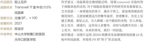 这些作品几乎均为创作者在日常科研工作中以不同的技术手段捕捉到的微观生命瞬间,科学的“透镜”似乎为我们展现出一幅幅艺术的“魔幻”,一边是细胞、分子层面的微观抵达,另一边好似一块既陌生又熟悉的“优诗美地”。这里,本是科学严谨的领地,因为其关乎生灵,便开启人们自由逸放的审美思绪。在此,我们惊叹中国古代哲学体系中“天人合一、道法自然”的天道规律。原来早于现代科学,这种“尽精微而致广大”的宇宙观便已根植于我们生存的大地。感谢各位作者以他们现代技术的视野,为我们定格生命律动的瞬间,张扬蓬勃的艺术活力。换一个视角,生命的风景便呈现“天地人”的和谐和统一,换一种思路,生命的哲学便更能诠释苦难与幸福的非凡境遇。