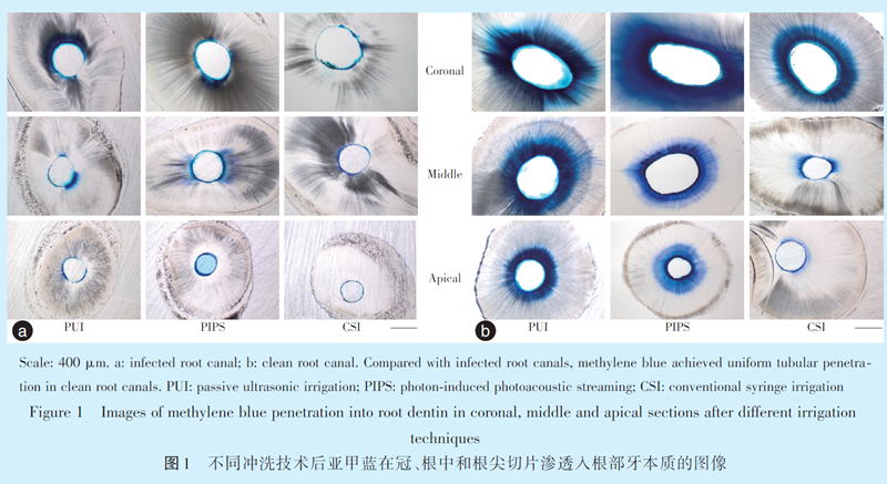干燥后于牙齿表面涂布无色油漆以避免牙齿的外表面着色。在根管中注入2%亚甲基蓝溶液,活化1 min,以可视化冲洗剂的渗透深度[13]。吸潮纸尖干燥根管后,用光固化流动树脂Z350充填根管的冠方入口。牙齿干燥储存。