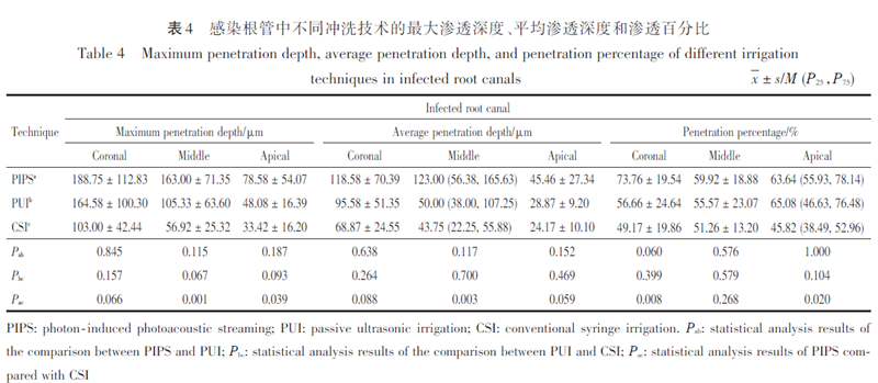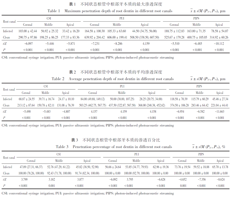在感染根管的冠方,PIPS 组的渗透百分比大于CSI组(P<0.05);PUI组和CSI组的渗透深度和渗透百分比差异无统计学意义(P>0.05);PIPS组和PUI组的渗透深度和渗透百分比差异无统计学意义(P>0.05,表4)。在感染根管的根中部,PIPS组的最大渗透深度以及平均渗透深度均大于CSI组(P<0.05);PUI组和CSI组的渗透深度和渗透百分比差异无统计学意义(P>0.05);PIPS 组和PUI组的渗透深度和渗透百分比差异无统计学意义(P>0.05)。在感染根管的根尖,PIPS组的最大渗透深度以及渗透百分比均大于CSI 组(P<0.05);PUI组和CSI组的渗透深度和渗透百分比差异无统计学意义(P>0.05);PIPS 组和PUI 组的渗透深度和渗透百分比差异无统计学意义(P>0.05)。
